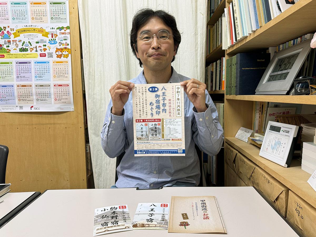 【八王子の印刷会社が期間限定「御宿場印」販売】通常版のパネルを持つ増沢さん