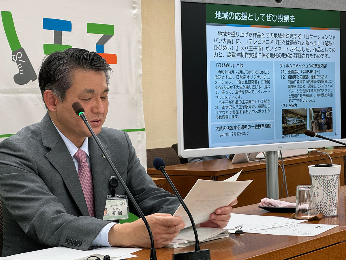 テレビアニメ「日々は過ぎれど飯うまし」と、作品の舞台になった八王子市が「ロケーションジャパン大賞」の候補に選ばれたことを受け、初宿和夫八王子市長が11月21日、一般投票への協力を呼びかけた。