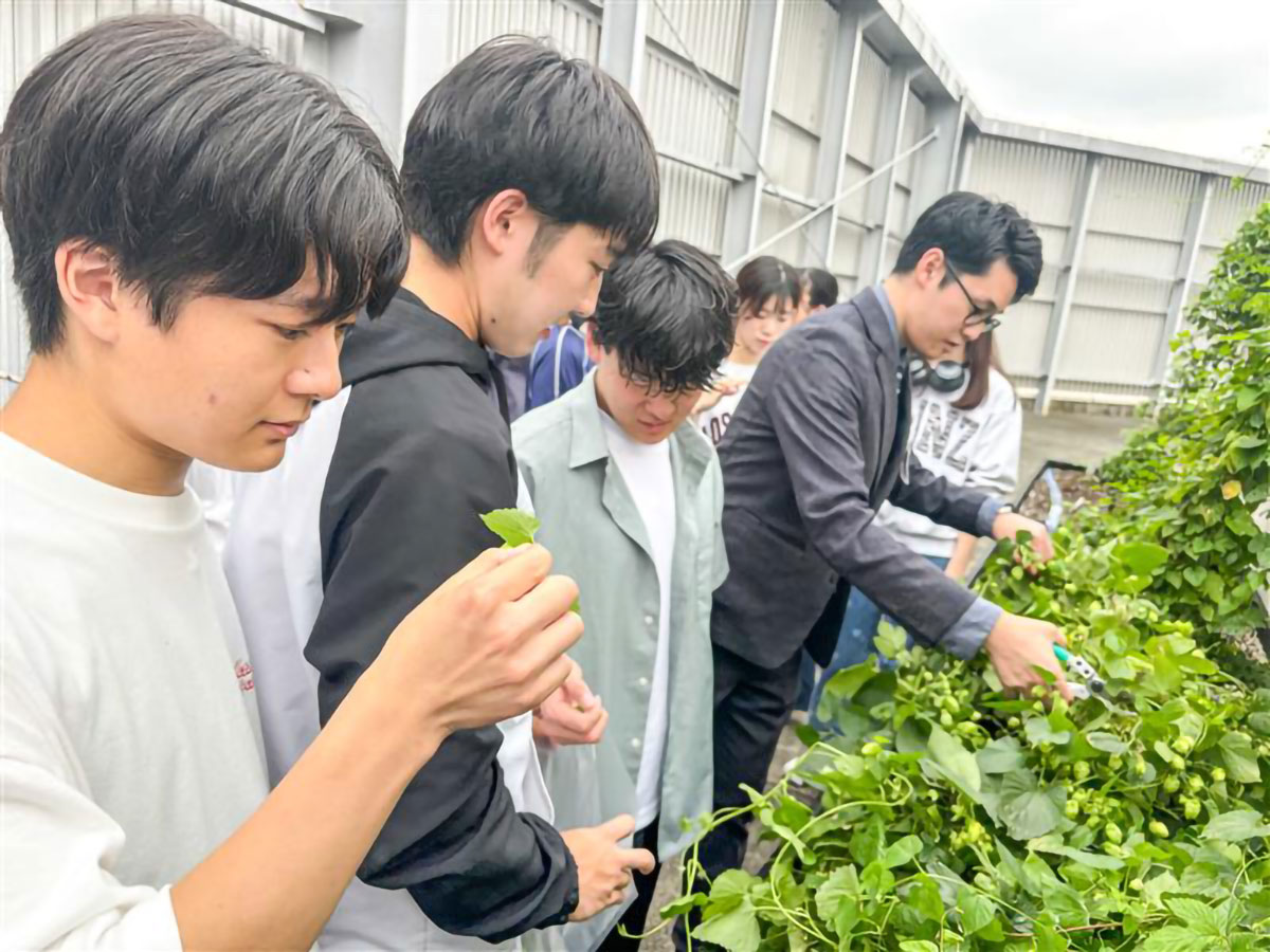 【学生が育てた材料で造ったビールをイベントで販売】学生によるホップ収穫の様子