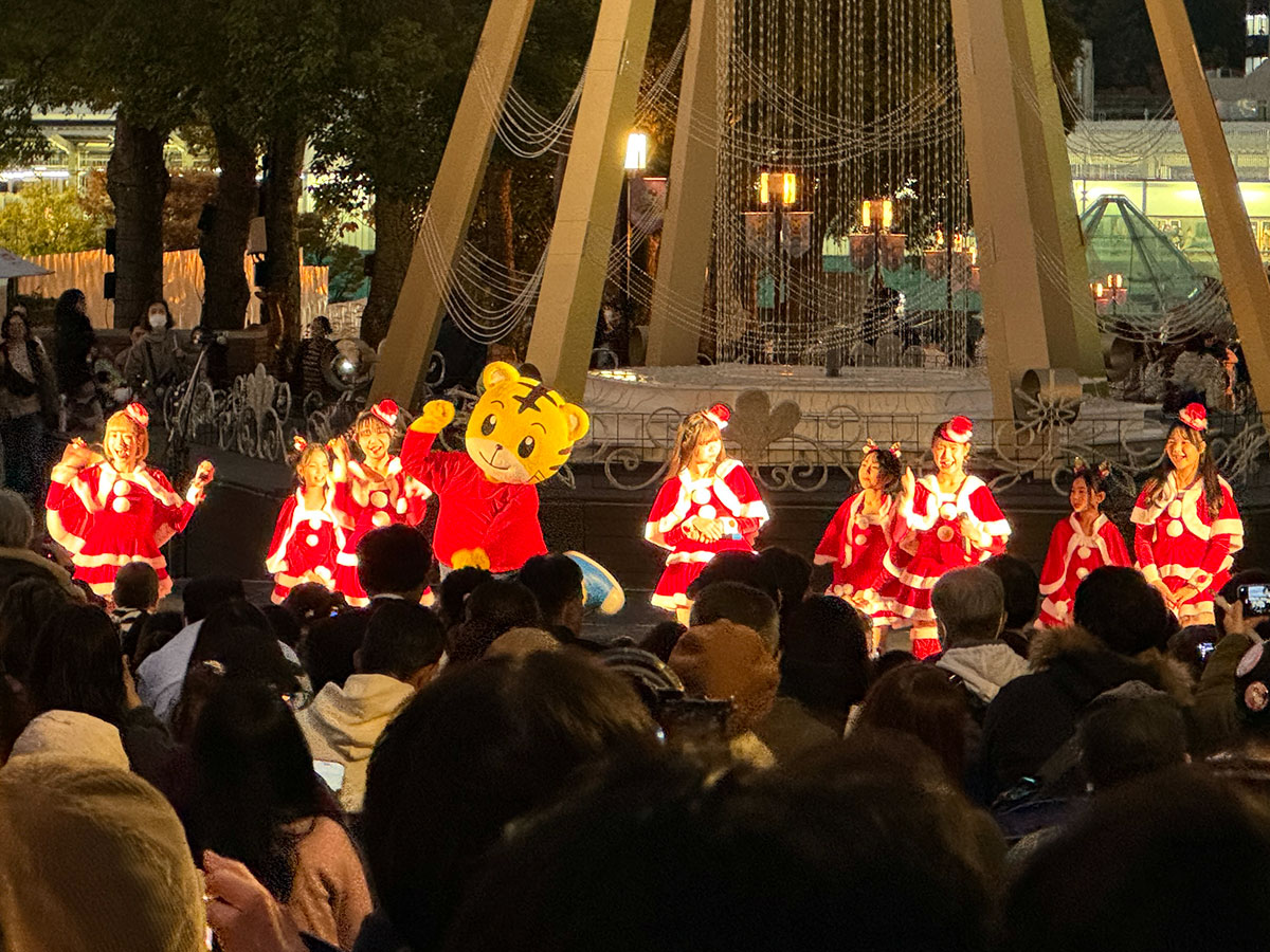 「多摩センターイルミネーション2025」が11月15日、京王相模原線・小田急多摩線「多摩センター駅」前のパルテノン大通りで始まった。点灯式でパフォーマンスを披露する多摩市のご当地アイドル「des ailes 26」と「しまじろう」