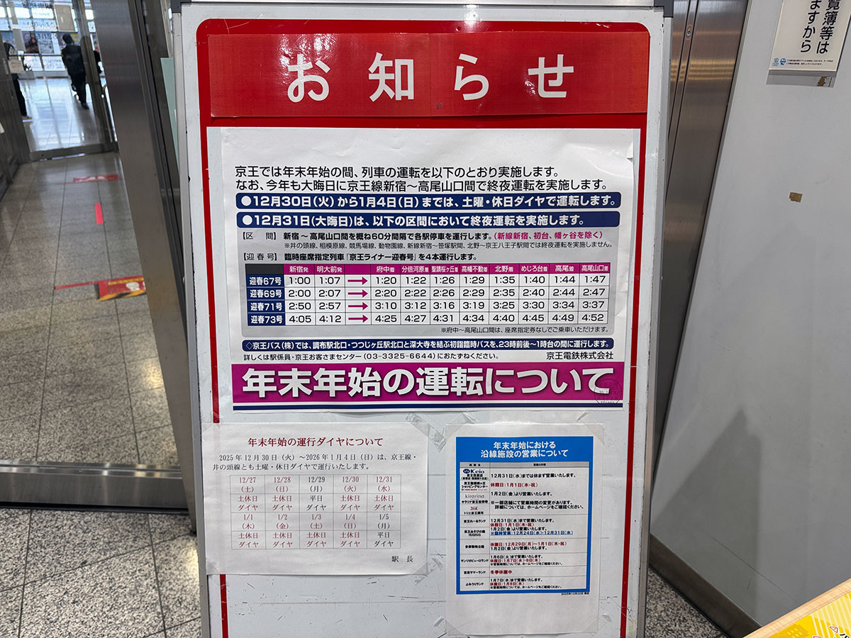 広域八王子圏の2025年の年末年始、JR・私鉄・バス各社の対応についてまとめた。