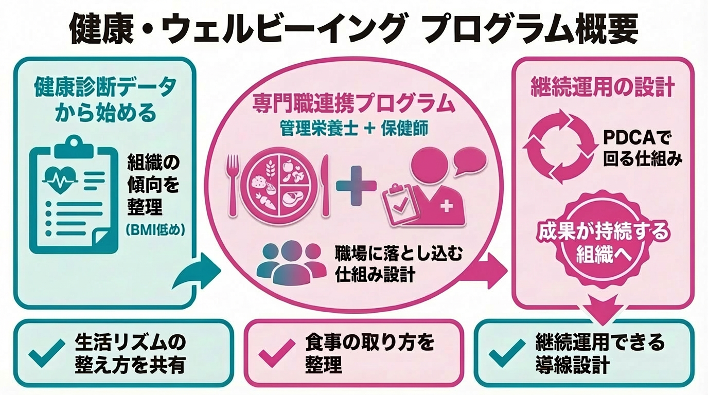 体重が軽めな傾向(BMIが低めな傾向)は、扱いが難しく見える一方で、職場としての生活リズム設計や情報提供の整理によって、取り組みとして回しやすくなるテーマです。大切なのは、健康診断データを起点に、取り上げるテーマと順番を整理し、専門職の役割分担と運用ルールを揃えて、社内で回る形に落とすことです。