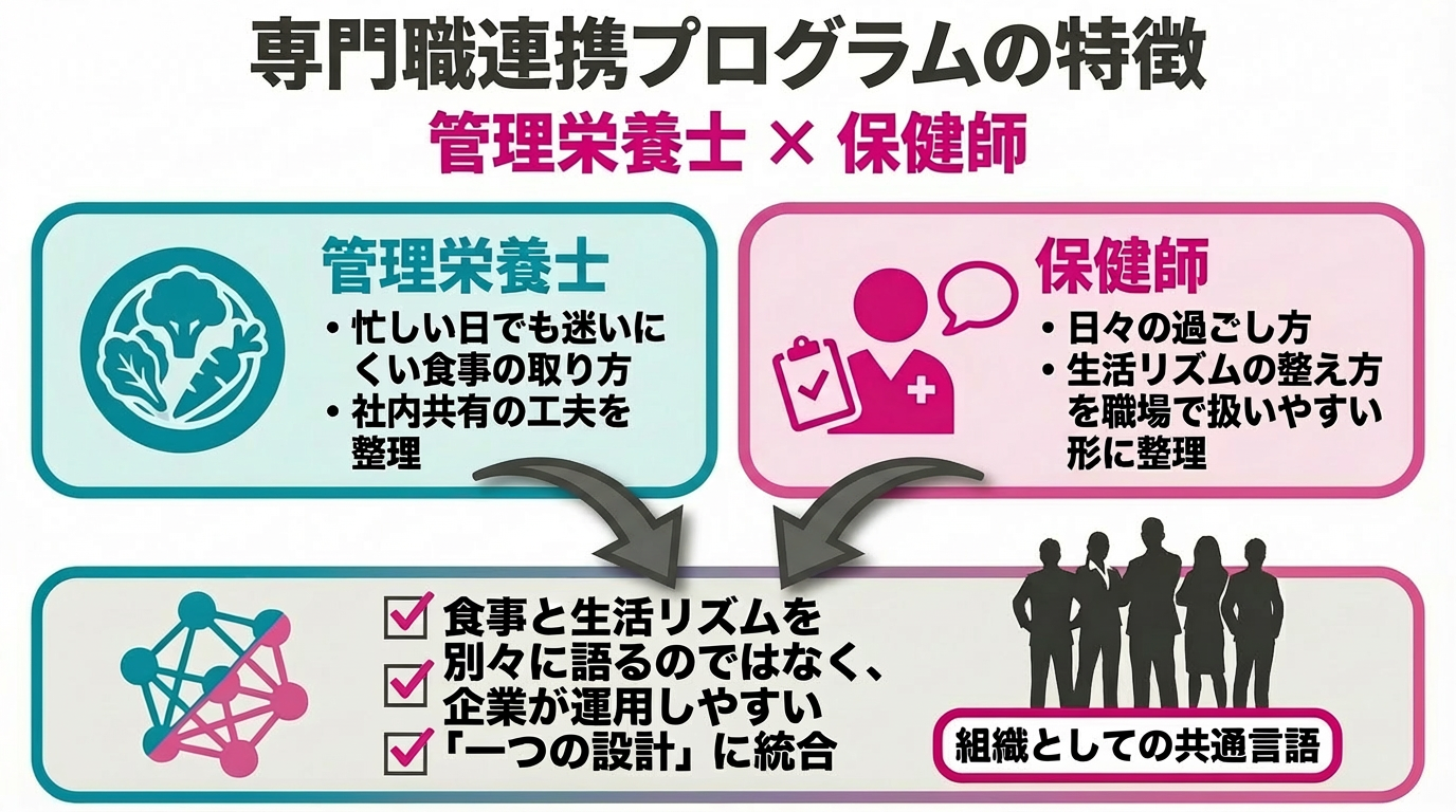 食事と生活リズムを別々に語るのではなく、企業が運用しやすい「一つの設計」として整える点が特徴です。