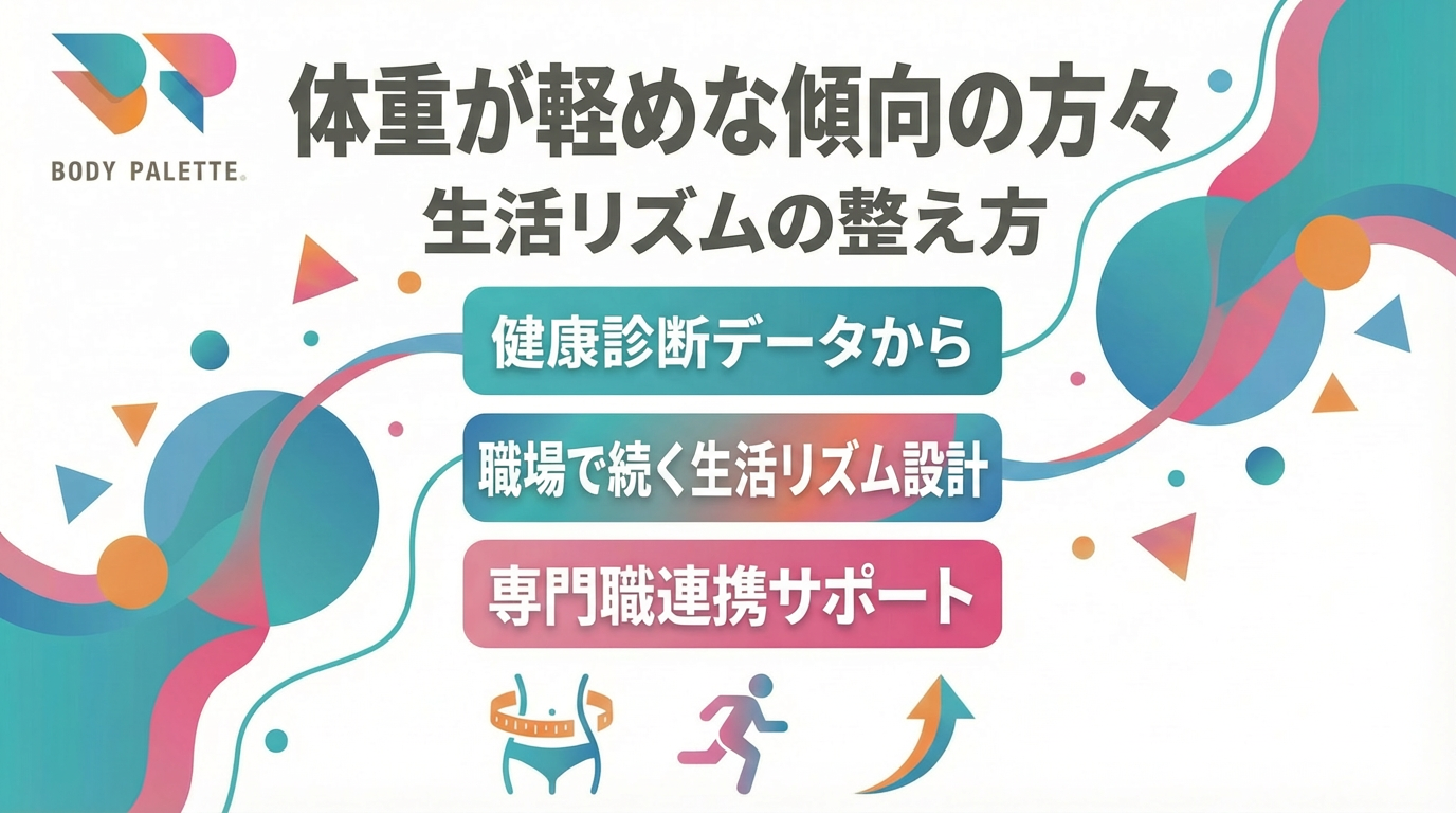 体重が軽めな傾向(BMIが低めな傾向)は、目立ちにくいテーマとして後回しにされやすい一方で、働き方や生活リズムの乱れが重なると、日々のコンディションや集中のしやすさに影響が出やすく、組織としてのマネジメント観点でも扱い方の設計が求められます。だからこそ、個人任せにせず、職場として「整え方」を共有できる仕組みに落とすことが重要になります。