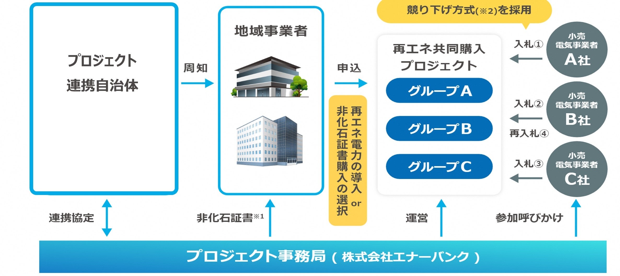 複数の事業者が共同で電力を購入することでスケールメリットが生まれ、個別購入に比べて安価に再生可能エネルギーを導入することができる仕組みです。