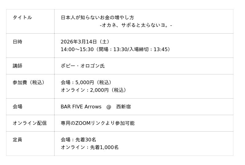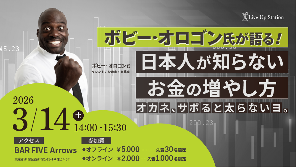 タレント・格闘家・実業家 ボビー・オロゴン氏による「日本人が知らないお金の増やし方」特別セミナーを3月14日(土)BAR FIVE Arrows@新宿とオンライン@ZOOMでハイブリッド開催!