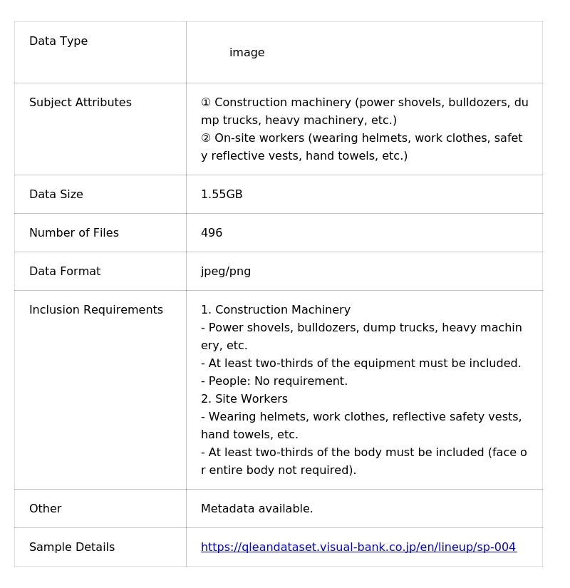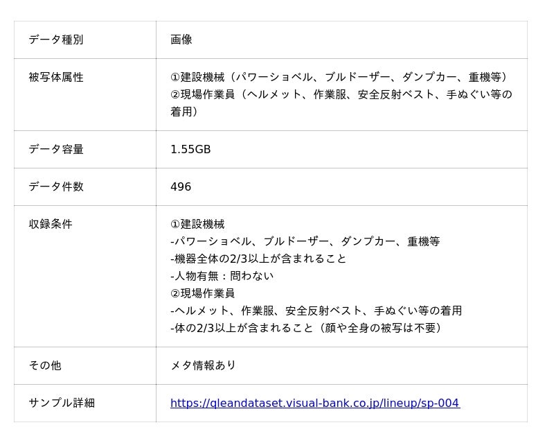 Visual Bank株式会社(東京都港区、代表取締役CEO 永井真之)は、傘下の株式会社アマナイメージズを通じて展開するAI学習用データソリューション「Qlean Dataset(キュリンデータセット)」において、生成AIやマルチモーダル基盤モデルの事前学習・追加学習、ならびに物体検知、人物検知、画像分類、セマンティックセグメンテーションなどのコンピュータビジョン分野のAI開発・研究に活用される「建設現場作業員・建設機械画像データセット」の提供を開始しました。