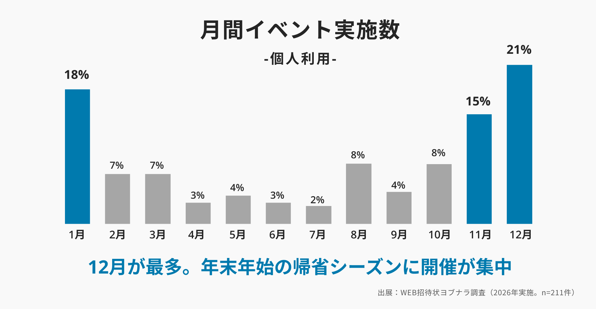 個人イベントの開催月は、12月(21%)が最多となり、1月(18%)、11月(15%)が続きました。